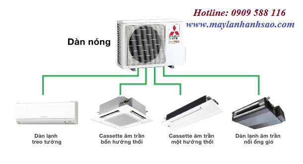 Máy lạnh multi Mitsubishi rất đa dạng về chủng loại dàn lạnh: dàn lạnh treo tường,dàn lạnh giấu trần nối ống gió,dàn lạnh âm trần Cassette,...cho phép người dùng xậy dựng hệ thống điều hòa chuẩn "khách sạn 5 sao" cho gia đình bằng cách kết hợp dàn lạnh treo tường cho phòng ngủ và dàn lạnh giấu trần nối ống gió,dàn lạnh âm trần Cassette cho phòng khách.