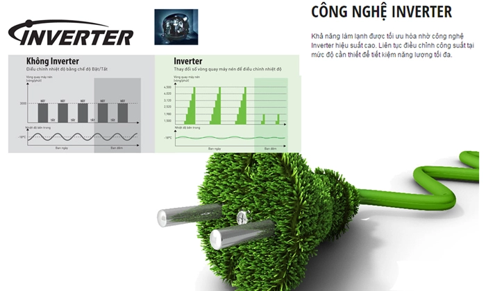 Tiết kiệm điện năng tiêu thụ lên đến 70% với công nghệ biến tần Inverter.Bên cạnh đó,máy vận hành ổn định và siêu êm ái