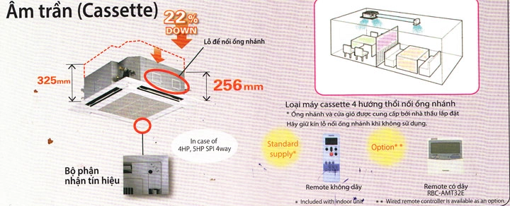 Dàn lạnh Cassette góc thổi gió 360 độ cho luồng khí lan tỏa khắp phòng.