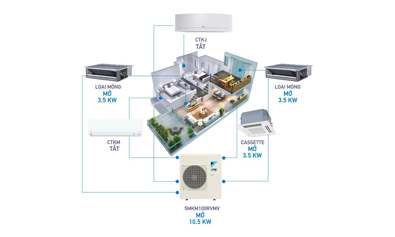 - Cho phép kết nối lên đến tối đa 5 dàn lạnh với duy nhất 1 dàn nóng