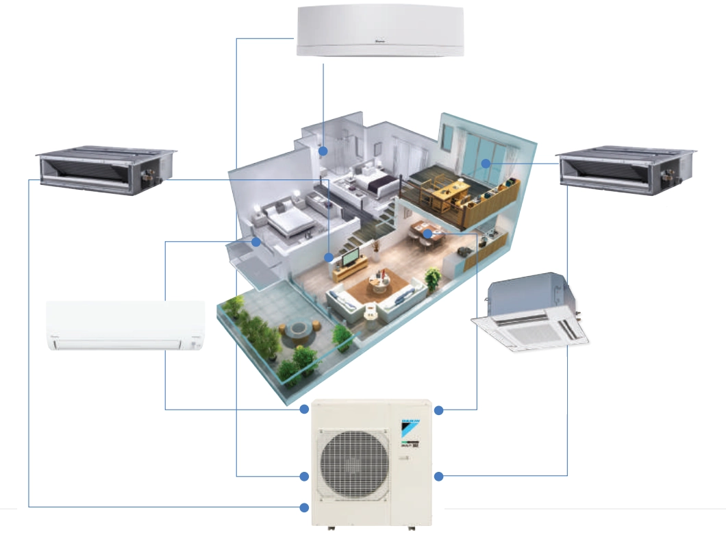 Máy Lạnh Multi Daikin chỉ cần một dàn nóng để duy trì sự thoải mái tối đa cho 5 phòng. Vô số lợi ích được cung cấp bởi hệ thống Multi được tăng cường bởi bộ điều khiển Inverter DC của Daikin và sử dụng môi chất lạnh thế hệ mới R32.