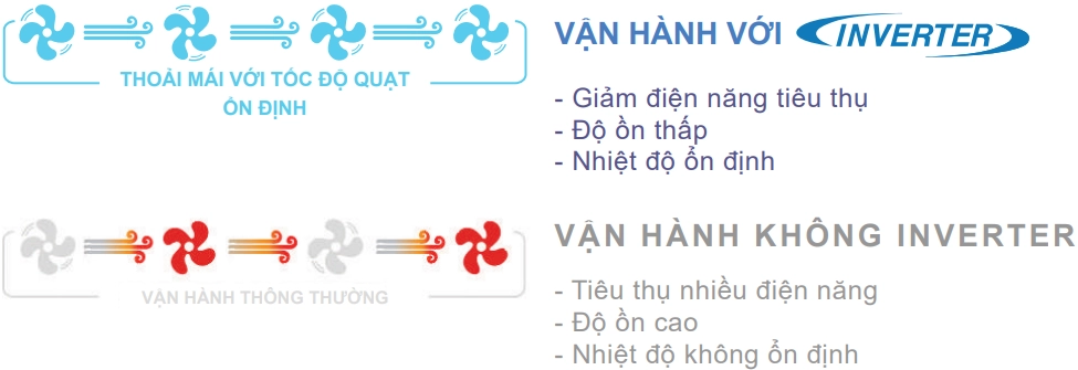 Công nghệ Inverter hiệu quả đáng kể hơn so với hệ thống Inverter. Tiết kiệm điện năng nhiều hơn, trong khi vẫn duy trì ổn định nhiệt độ ở một mứac thoải mái suốt cả ngày lẫn đêm.