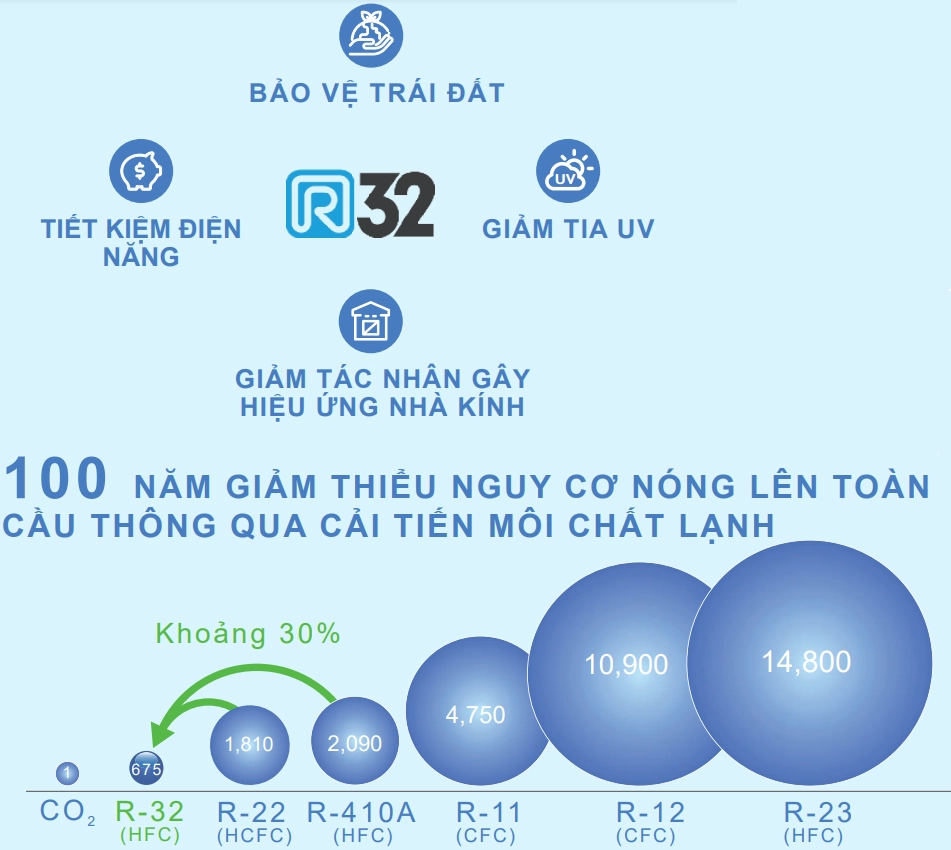 – Sử dụng Gas R32: Không phá hủy tầng ôzôn. Giảm tác nhân gây nóng lên toàn cầu. Tăng cường hiệu suất sử dụng năng lượng.