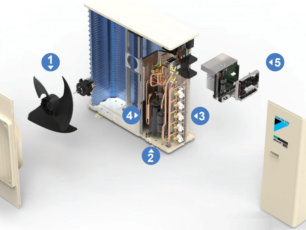 Nhằm hài hòa với nội thất, Daikin đã thiết kế đặc biệt tất cả các dàn nóng có chiều cao dưới 1.000 mm. Dàn nóng có công suất 10,0kW chỉ có 900 mm chiều cao và có thể kết nối đến 5 đơn vị trong nhà.