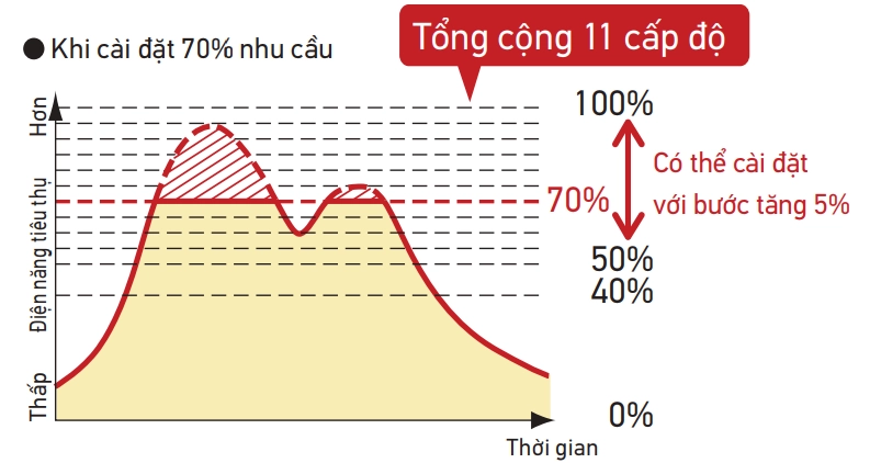 Giới hạn điện năng tiêu thụ được cài đặt chính xác với 11 cấp độ. Có thể thực hiện cắt giảm công suất đỉnh tùy theo từng trường hợp cụ thể.