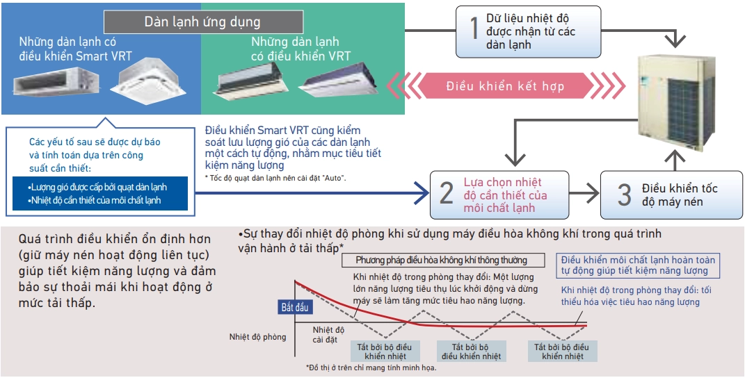 Daikin đã phát triển tính năng điều khiển Smart VRT bằng cách kết hợp kiểm soát lưu lượng gió (VAV: Lưu lượng gió hiệu quả) cho các dàn lạnh có điều khiển smart VRT, cũng như tối ưu hóa tốc độ của máy nén bằng cách tính toán tải cần thiết cho toàn bộ hệ thống và nhiệt độ môi chất lạnh đạt mức tối ưu dựa trên dữ liệu nhận được từ các dàn lạnh. Kết hợp với điều khiển lưu lượng gió sẽ làm giảm tải cho máy nén và giảm thiểu những tổn thất vận hành dựa trên sự kiểm soát chặt chẽ. Tính năng Smart VRT đảm bảo tiết kiệm năng lượng hiệu quả và điều hòa không khí thoải mái để đáp ứng các điều kiện vận hành thực tế.