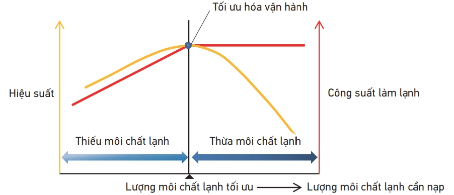 Chức năng tự động nạp môi chất lạnh sẽ tự động xác định lượng môi chất lạnh tối ưu cần được nạp. Chức năng này giúp ngăn ngừa sự thiếu tải hoặc tổn thất năng lượng do môi chất lạnh bị thừa hoặc thiếu.