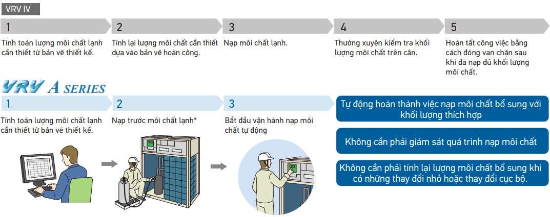 Chức năng tự động nạp môi chất lạnh sẽ tự động hóa việc nạp một lượng môi chất lạnh thích hợp và đóng van chặt một cách đơn giản bằng cách nhấn nút khi đã nạp trước. Đơn giản hóa việc lắp đặt sẽ loại trừ được sự thiếu hay thừa lượng nạp môi chất lạnh do sai sót trong việc tính toán, điều này dẫn đến chất lượng lắp đặt cao hơn.