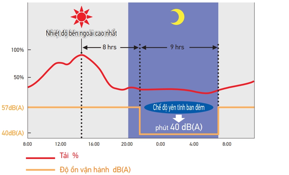 Chế độ vận hành ban đêm sẽ bắt đầu sau khi nhiệt độ ngoài trời đạt mức cao nhất được 8 giờ và duy trì liên tục trong 9 giờ kế tiếp trước khi vận hành bình thường trở lại.
