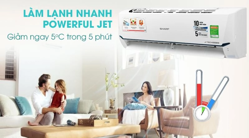 Với công nghệ làm lạnh nhanh Powerful bạn chỉ mất năm phút để giảm 5°C ngay sau khi mở máy lạnh Sharp 1.0HP. Công nghệ này có thể cho lưu lượng khí lạnh và tốc độ làm lạnh nhanh hơn 28% so với máy lạnh không có công nghệ làm lạnh nhanh Powerful Jet.