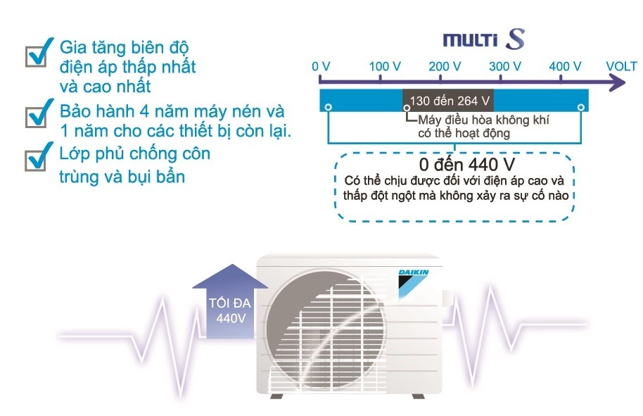 Bo mạch chính có thể chịu được các biến động điện áp cao và thấp từ 130 đến 440V. Máy điều hoà không khí Daikin có thể vận hành bình thường khi điện áp trong khoảng 130 và 264V. Ngay cả khi điện áp biến đổi đột ngột từ 0 đến 440V, máy điều hoà không khí Daikin vẫn có thể hoạt động trở lại mà không xảy ra sự cố gì. Daikin Multi S hoạt động trong điều kiện áp biến động quá cao hoặc quá thấp mà không xảy ra sự cố!