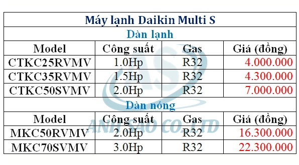 Mời quý khách xem qua bảng giá tham khảo của máy lạnh Multi S Daikin:
