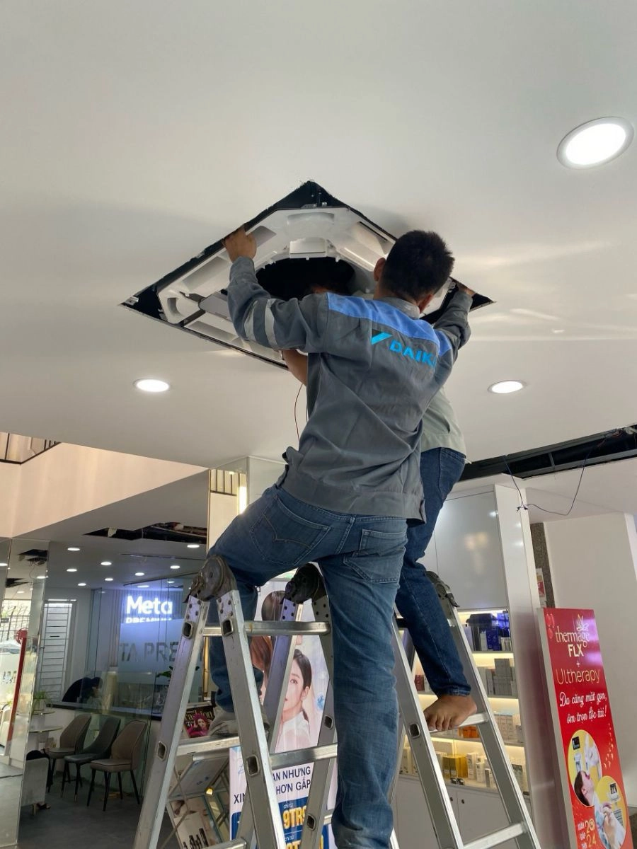 Với điều hòa âm trần cassette, quá trình bảo dưỡng dàn lạnh chủ yếu diễn ra bên dưới máy sau khi kỹ thuật viên gỡ lớp mặt nạ thiết bị.
