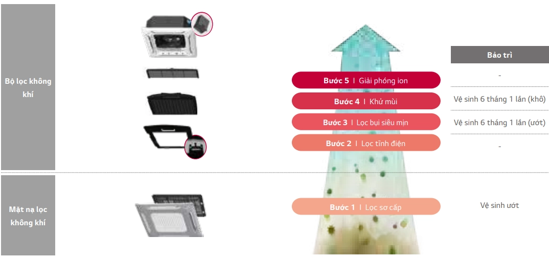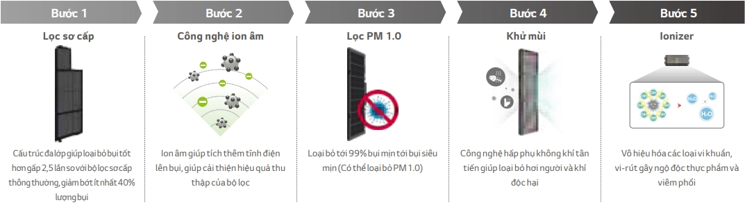 Trải qua 5 bước trong quy trình làm sạch không khí loại bỏ bụi siêu mịn, mùi khó chịu và vi khuẩn để đảm bảo một môi trường sống trong sạch, và lành mạnh.