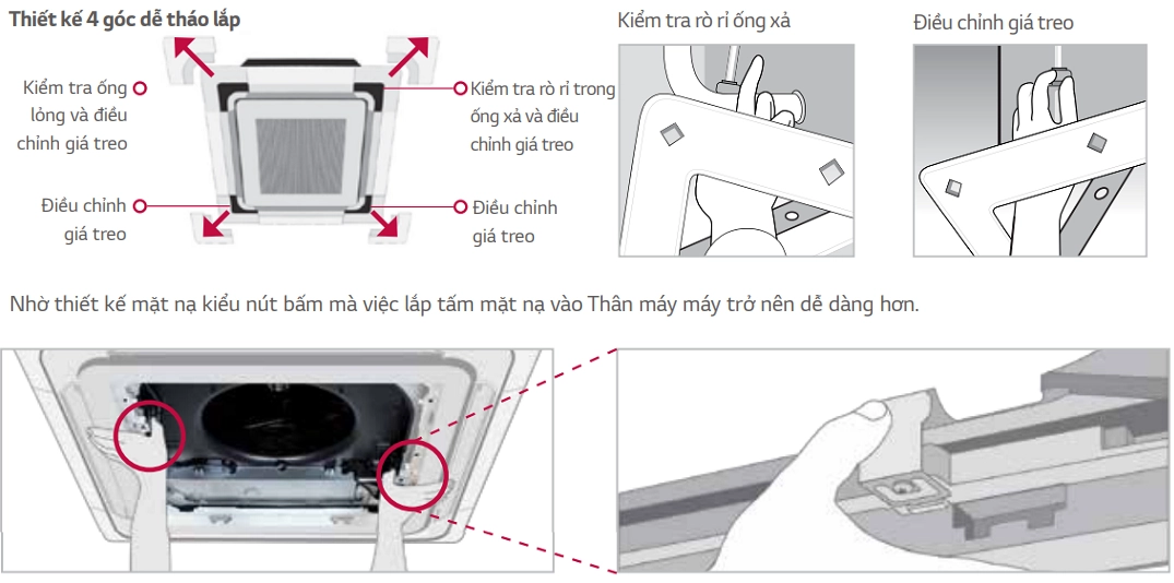 Thiết kế 4 góc dễ tháo lắp cho phép bạn dễ dàng điều chỉnh giá treo trong quá trình lắp đặt, đồng thời dễ kiểm tra rò rỉ trong đường ống xả. Ngoài ra, nhờ thiết kế mặt nạ kiểu nút bấm mà việc lắp mặt nạ vào thân máy trở nên dễ dàng hơn.