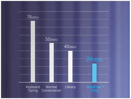 Cassette WindFreeTM 1 hướng làm giảm tiếng ồn tạo ra do phân tán gió. Ở chế độ thấp, máy thiết lập trạng thái gần như yên tĩnh với âm thanh chỉ vào khoảng 24dB(A), ít hơn đáng kể so với chế độ làm lạnh thông thường. Đây là giải pháp điều hòa lý tưởng cho những không gian thư giãn, cần sự tập trung hoặc những người nhạy cảm với độ ồn như thư viện, phòng hội nghị, phòng làm việc tiêu chuẩn cao.
