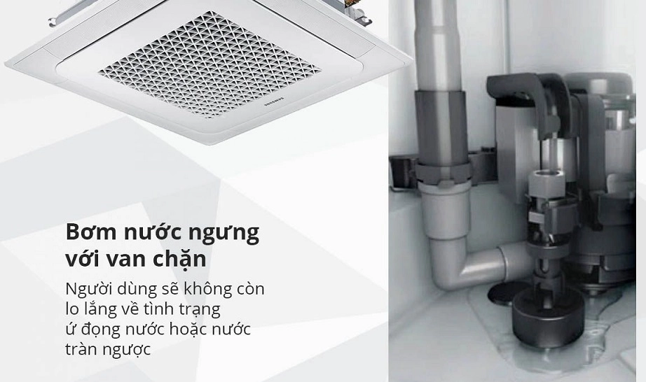 Người dùng sẽ không cần phải lo lắng về tình trạng ứ đọng nước hoặc nước tràn ngược với máy lạnh Cassette 4 hướng WindFreeTM vì bơm nước ngưng đã có sẵn van chặn sẽ hạn chế nước tích tụ, ngăn nước chảy ngược lại và nhỏ giọt vào không gian trong nhà, góp phần loại bỏ nấm và vi khuẩn có hại cho môi trường sống.