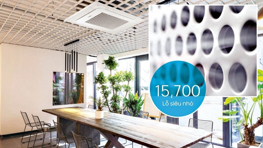 Với mặt nạ được thiết kế từ hàng chục ngàn lỗ nhỏ Micro-holes, luồng gió lạnh nhẹ nhàng phân tán đều giúp cho căn phòng được làm mát êm dịu, Tạo ra "Môi trường tĩnh". Giúp loại bỏ hiện tượng khó chịu do gió buốt thổi trực tiếp vào người.