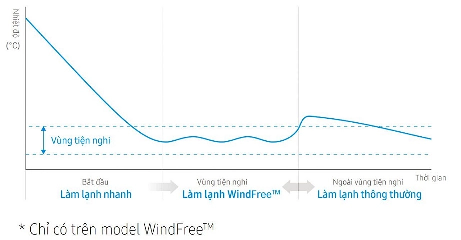 Khi khởi động, điều hòa sẽ hoạt động theo cơ chế làm lạnh phòng đến nhiệt độ mong muốn nhanh nhất có thể, sau đó tự động chuyển sang chế độ WindFreeTM để duy trì nhiệt độ phù hợp nhất mà vẫn đảm bảo luồng khí mát dễ chịu cho người dùng. Trong trường hợp nhiệt độ vượt ra khỏi vùng tiện nghi, máy sẽ tự động điều chỉnh lại.