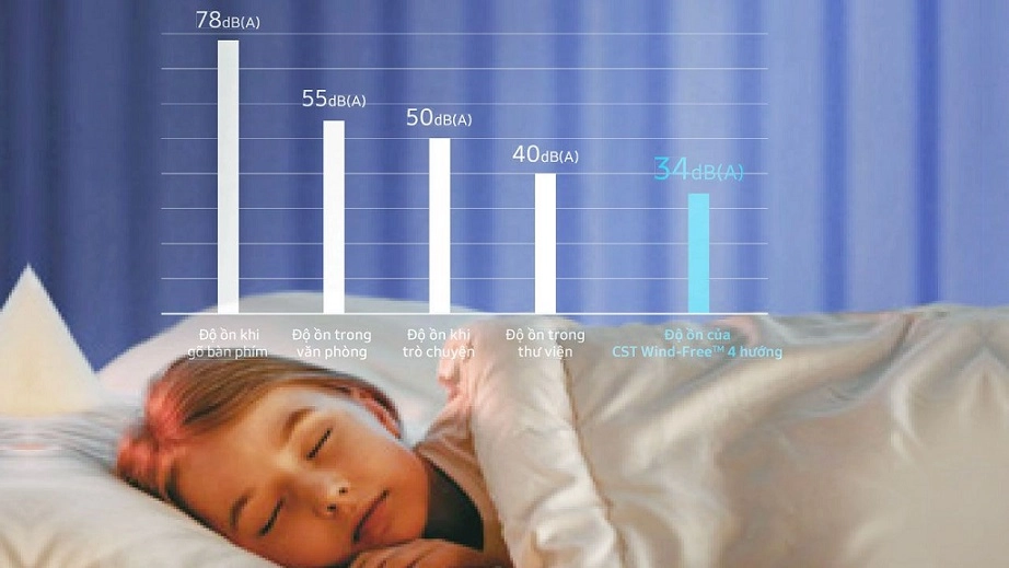 Ở chế độ vận hành WindFreeTM, Cassette 4 hướng WindFreeTM chỉ tạo ra âm thanh khoảng 34dB (A), ít hơn đáng kể so với chế độ làm lạnh thông thường. Đây là giải pháp điều hòa hoàn hảo cho những môi trường cần đến sự yên tĩnh nhu thư viện, trường học hay phòng ngủ.
