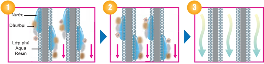 Cơ chế làm sạch bẳng công nghệ Aqua-Resin cho dàn lạnh.
