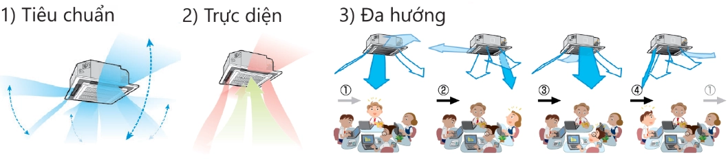 Cài đặt riêng từng vị trí cửa gió: 3 chế độ đảo gió khác nhau: tiêu chuẩn; đối diện theo đường chéo và quay đầu.
