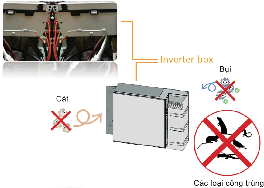 Hộp biến tần được đóng kín hoàn toàn để tránh hỏng hóc do cát, bụi và côn trùng chui vào gây ra hỏng hóc.