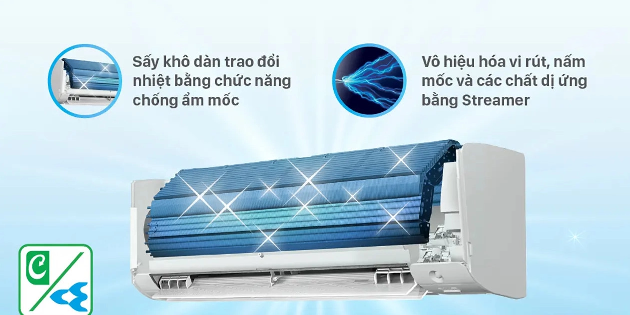 - Bên cạnh đó luồng điện Streamer phóng ra song song đồng thời và làm khô bên trong dàn lạnh, dàn tản nhiệt và đường thổi gió, làm vô hiệu hóa các chất độc hại như vi rút, nấm mốc và các chất gây dị ứng.