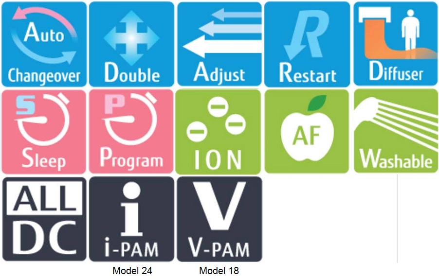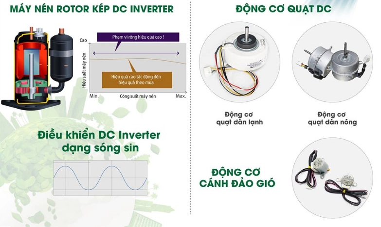 Vận hành hiệu quả cao được thực hiện bằng cách sử dụng bộ điều khiển DC Inverter dạng sóng sin.