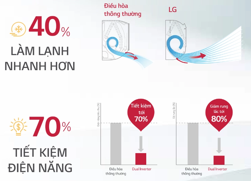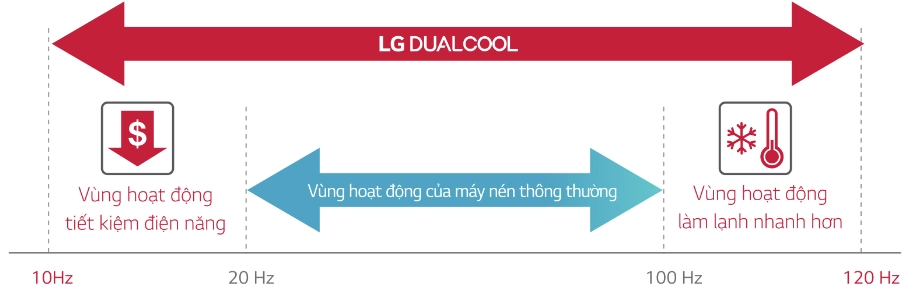 Công nghệ áy nén Dual Inverter với thiết kế đặc biệt giúp motor máy nén có thể hoạt động ở dải tần số rộng hơn các dòng máy nén thông thường.