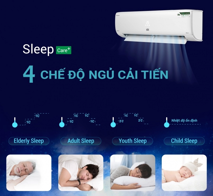 Nhằm mang đến giấc ngủ êm ái nhất cho tất cả thành viên gia đình, chế độ ngủ của SK Series Gold Inverter không chỉ loại bỏ độ ồn mà còn được phát triển thành 4 chương trình khác nhau phù hợp nhu cầu từng độ tuổi. Mỗi chương trình được thiết kế mặc định kéo dài 8 tiếng, và tự động tăng/giảm khoảng nhiệt phù hợp sau mỗi 1 giờ. Người dùng có thể dễ dàng chọn đường cong nhiệt phù hợp bằng cách bấm nút SLEEP trên điều khiển để lần lượt chuyển các chế độ.