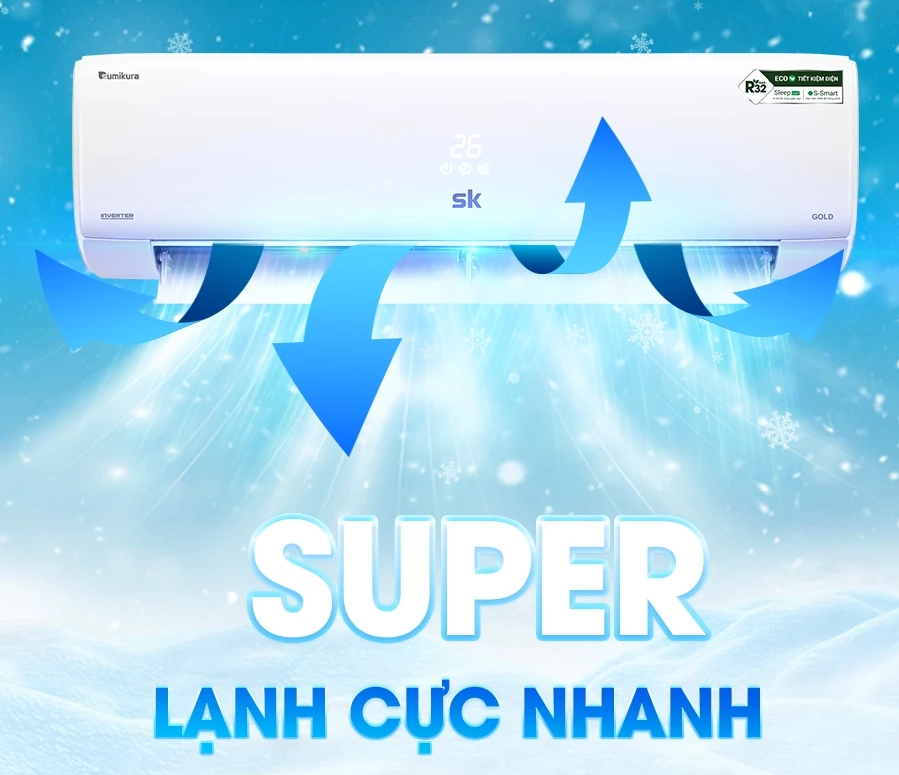 Khác với các loại máy lạnh Inverter thông thường, SK Series Gold Inverter vẫn có thể làm lạnh cấp tốc trong 30 giây. Khi sử dụng chế độ Super, máy sẽ hoạt động với công suất tối đa để lập tức xua tan khí nóng. Thời gian tăng tốc rút ngắn đồng nghĩa với việc nhiệt độ phòng được kiểm soát nhanh chóng hơn.