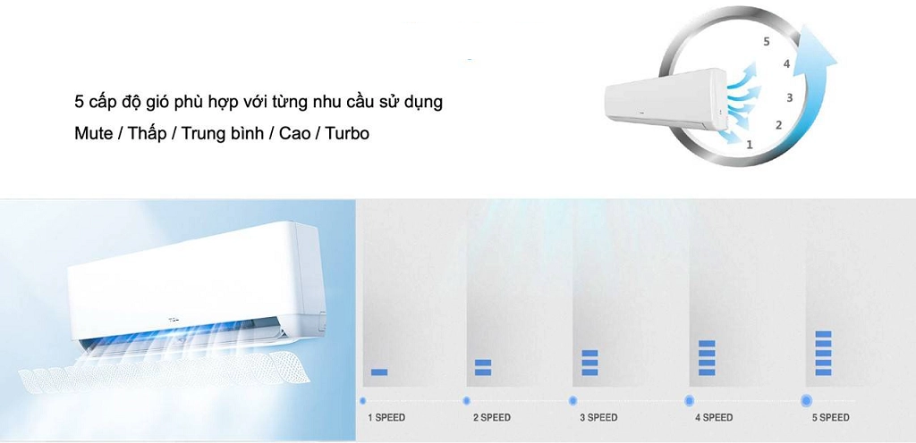 Máy lạnh còn được trang bị 5 cấp độ gió (Mute / Thấp / Trung bình / Cao / Turbo) đáp ứng từng nhu cầu sử dụng của người dùng.