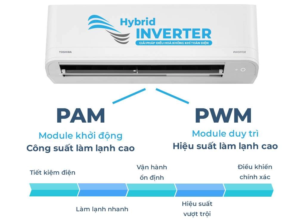 Trên máy lạnh với bộ điều khiển Toshiba Hybrid Inverter tích hợp 2 mô-đun điều khiển riêng biệt để đảm bảo sự thoải mái tự nhiên một cách liên tục và nhanh chóng đạt được hiệu suất năng lượng tối ưu.