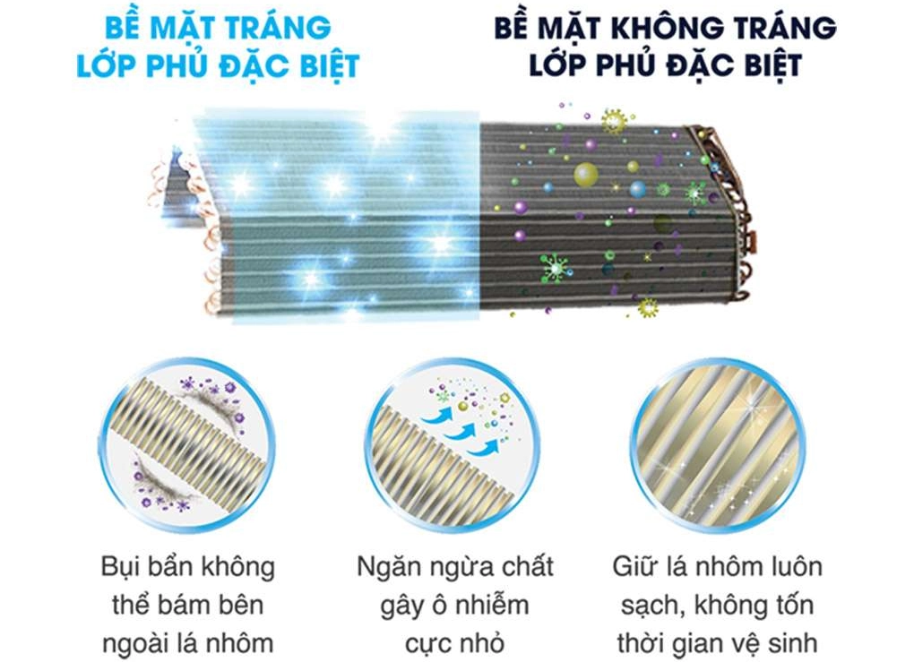 Trong quá trình hoạt động, hơi nước sẽ bám vào lá nhôm dàn lạnh và đọng thành giọt. Bụi bẩn sẽ bám vào và sinh nấm mốc, vi khẩn gây bệnh. Lá nhôm máy lạnh có phủ lớp chống bám bẩn làm nước không thể đọng trên bề mặt và trôi đi, mang theo bụi bẩn.