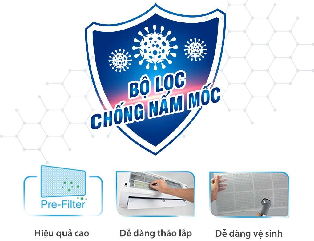 Máy lạnh được thiết kế lưới lọc chống nấm mốc. Đây là lớp bảo vệ đầu tiên có khả năng lọc bụi bẩn, chất gây kích ứng trong không khí cho không gian sống của bạn luôn trong lành.