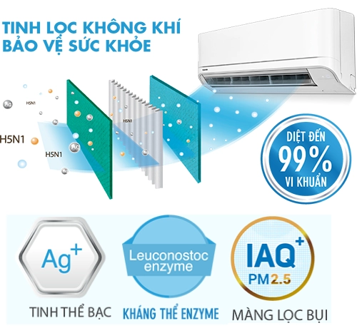 Thực tế, máy lạnh có thể tiêu diệt đến 99% vi khuẩn gây hại thông qua tinh thể bạc và đảm bảo tính kháng khuẩn cao, loại bỏ bụi mịn có kích thước siêu nhỏ nhờ vào tác nhân Leuconostoc enzym. Việc được sống, sinh hoạt, làm việc trong một môi trường trong lành chẳng còn là điều xa vời khi bạn lựa chọn sản phẩm này.