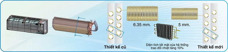 Bằng thiết kế cải tiến mới, thay đổi kích thước ống đồng nhỏ lại dẫn đến số lượng ống đồng và lá nhôm tăng lên nhiều hơn làm gia tăng diện tích bề mặt tiếp xúc giúp sự trao đổi nhiệt diễn ra nhanh hơn nên máy điều hòa có khả năng làm lạnh cực nhanh.