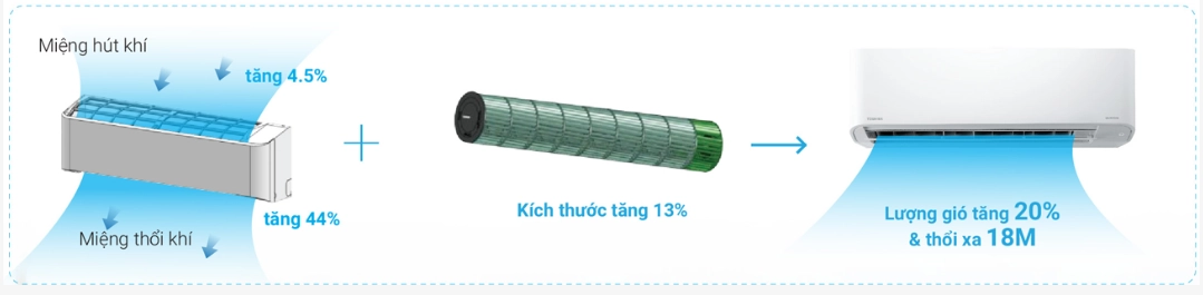 Nhờ thiết kế mới với kích thước tăng lên của miệng hút khí và miệng thổi khí cùng với thiết kế cánh quạt hình xiên mới và đường kính quạt tăng lên 13% giúp luồng gió thổi mạnh hơn, xa hơn đến 18m.