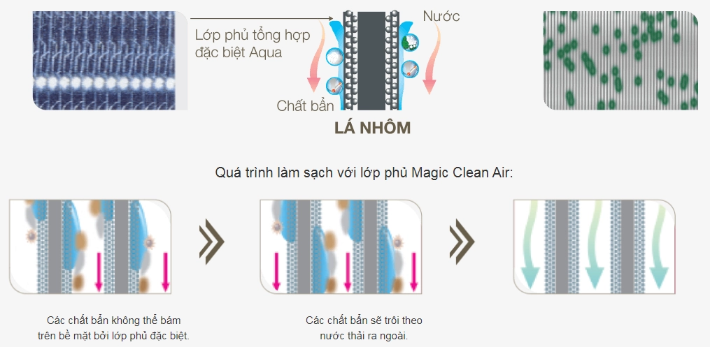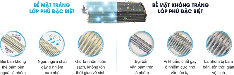Dàn lạnh được phủ một lớp đặc biệt, hệ thống trao đổi nhiệt sẽ hấp thụ và loại bỏ hoàn toàn bụi bẩn vi khuẩn, nấm mốc, các chất bẩn này sẽ trôi theo nước thải ra ngoài.