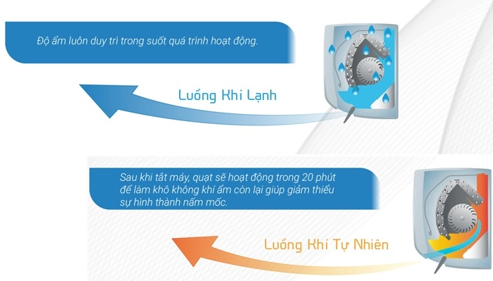 ⦁ Sau khi tắt máy, quạt sẽ hoạt động trong 20 phút để hong khô không khí ẩm còn lại bên trong các ống đồng giúp giảm thiểu sự hình thành vi khuẩn, nấm mốc.