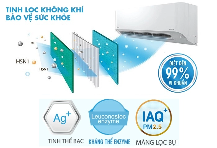 Công nghệ IAQ* Toshiba với 2 tác nhân leuconostoc enzyme & tinh thể bạc có khả năng ngăn chặn sự phát triển của vi khuẩn và vi rút giúp không khí luôn trong lành, tươi mát.