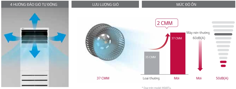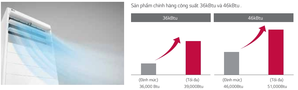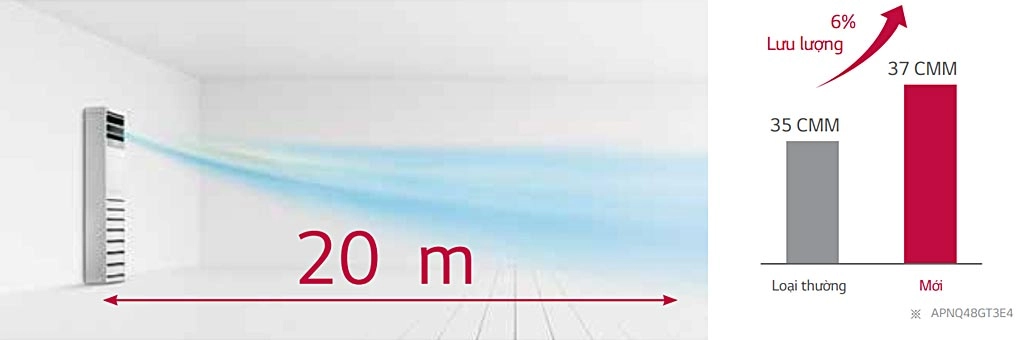 Máy điều hòa không khí tủ đứng mới của LG hoạt động rất hiệu quả ở những khu vực rộng lớn nhờ công suất làm lạnh mạnh mẽ. Tốc độ và lưu lượng thổi gió mạnh mẽ, luồng gió có thể được thổi ra xa khỏi máy điều hòa không khí tới 20 m.