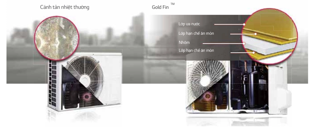 Lớp phủ đặc biệt màu vàng trên cánh tản nhiệt của bộ trao đổi nhiệt giúp ngăn ngừa tình trạng ăn mòn, kéo dài tuổi thọ của thiết bị.