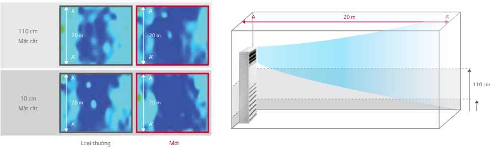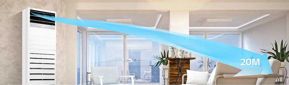 Máy lạnh tủ đứng mới của LG hoạt động rất hiệu quả ở những khu vực rộng lớn nhờ công suất làm lạnh mạnh mẽ. Tốc độ và lưu lượng gió đầy uy lực, tạo ra luồng gió thổi xa được tới 20m từ máy lạnh.