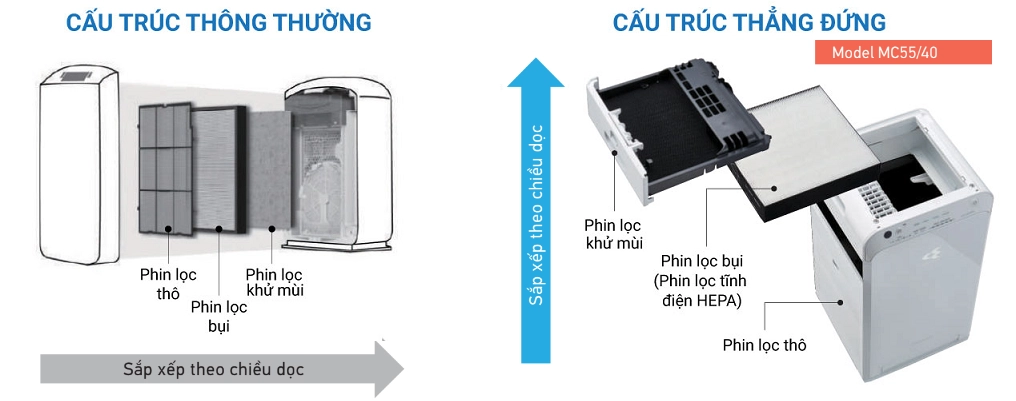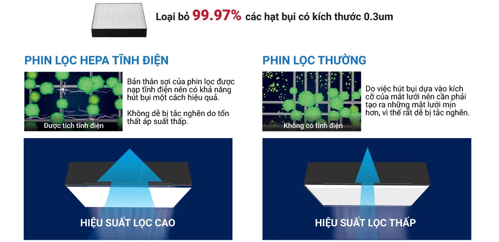 Được trang bị phin lọc hiệu suất cao có thể hút đến 99.97% các hạt bụi kích thước 0.3μm
