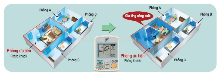 Chế độ ưu tiên sẽ ưu tiên công suất cho phòng được lựa chọn.Sau khi chọn phòng ưu tiên, phòng này sẽ được máy nén vận hành ưu tiên công suất làm lạnh từ các phòng khác.Công suất của dàn lạnh của phòng này sẽ được tăng lên bằng cách chuyển công suất từ phòng khác sang, do vậy công suất của các phòng không được ưu tiên sẽ giảm nhẹ. Sau 20 phút tất cả các dàn lạnh sẽ tự động trở về hoạt động ban đầu.