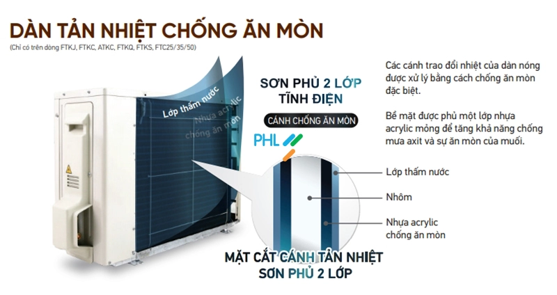 Cánh tản nhiệt của dàn nóng Multi S Daikin được xử lý chống ăn mòn đặc biệt, do vậy khả năng chống ăn mòn do mưa axit và muối gấp 5 đến 6 lần so với dàn nóng thông thường. Ngoài ra dàn nóng còn được lắp một tấm thép không gỉ dưới đáy để tăng cường độ bền.